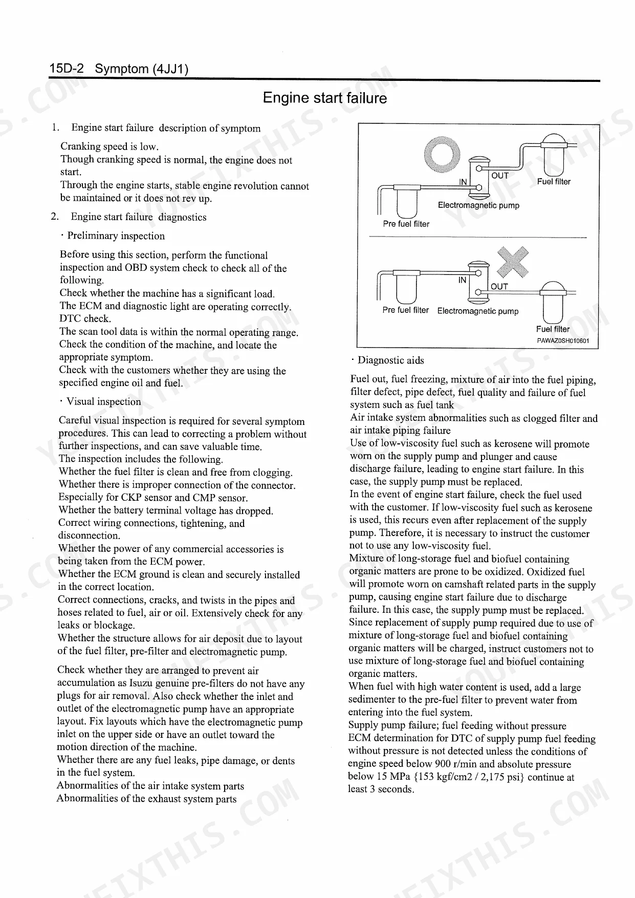 Isuzu 4JJ1 engine cranks but won't start after sitting overnight, low fuel pressure p. 103