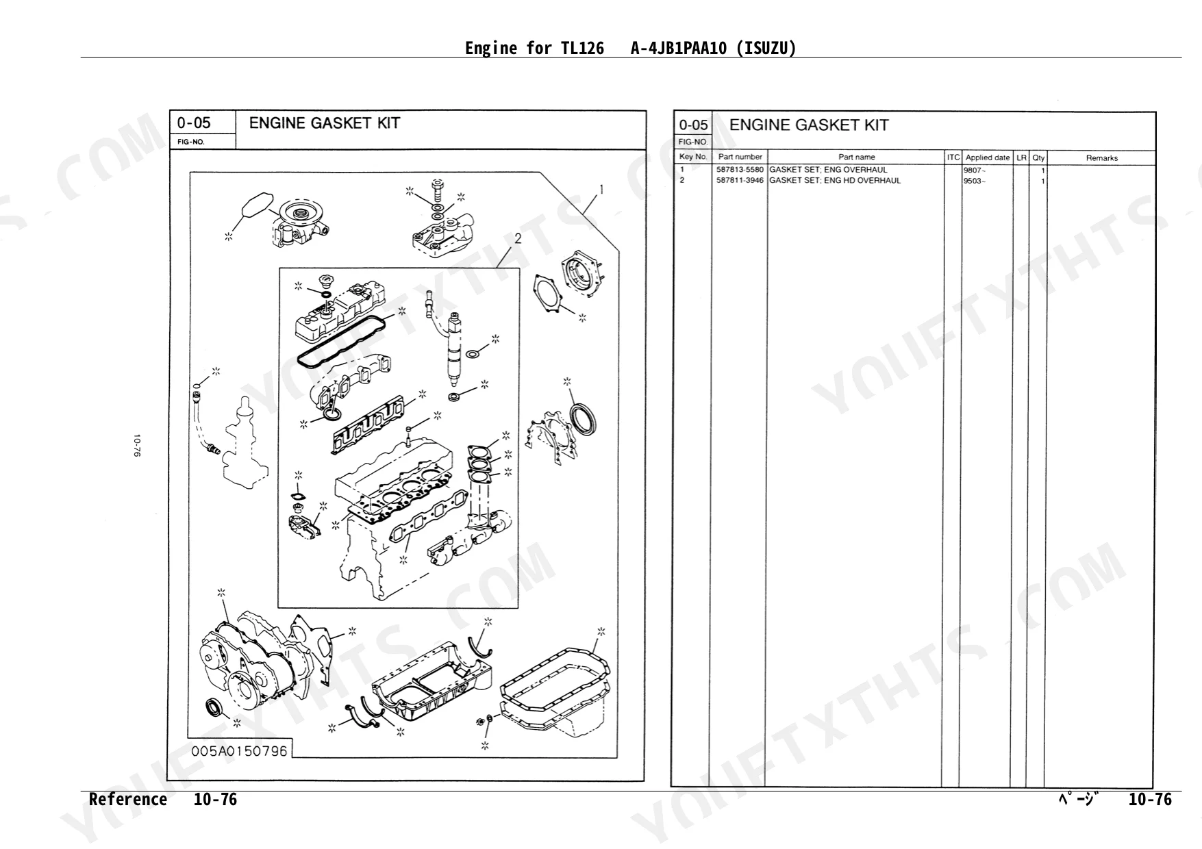 Need the right part number for a 1994-1998 4JB1 diesel in a TL126 or TL26 loader? This 59-page catalog has it. Every assembly gets its own exploded view with factory part numbers and dealer cross-references. Thirty-six pages of parts listings cover the cylinder head, crankshaft and piston assemblies, fuel injection system, injection pump internals, governor components, and engine electrical. Diagrams break each assembly down to individual gaskets, shims, and fasteners. Looking for the cylinder head gasket at T-1.65 mm thickness or the exact M11x122 head bolt? Every component is cataloged with its OEM number and dimensional callout. The 12V-2.2KW starter and 12V35A generator are listed with full breakdowns too. Bookmarked for quick navigation; pull it up on your phone at the parts counter, read off the number, and order with confidence.