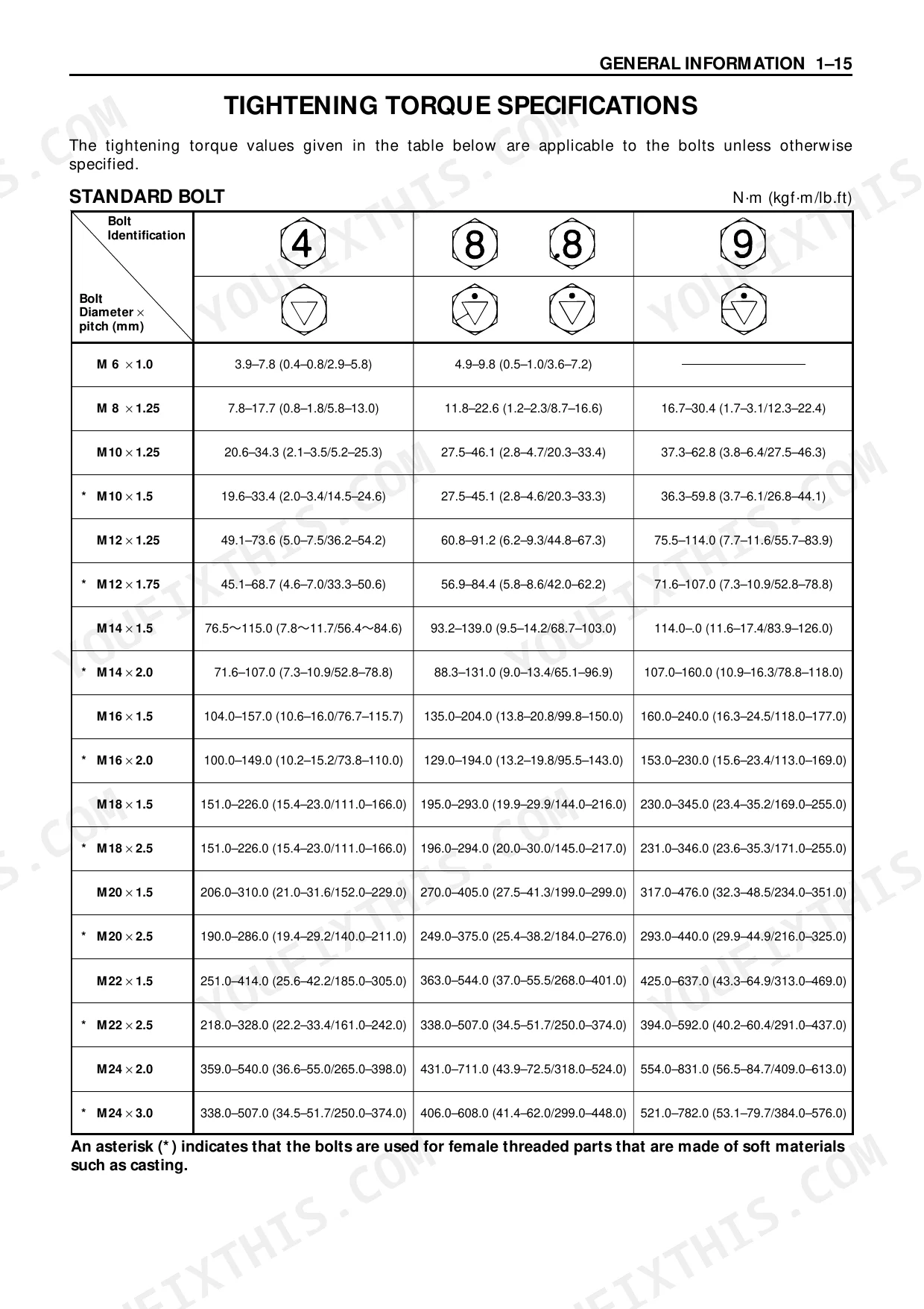 | Crankshaft Bearing Cap Bolt Torque | 226-245 (23.0-25.0/166-181) N·m (kgf·m/lb.ft) | p. 104 |
