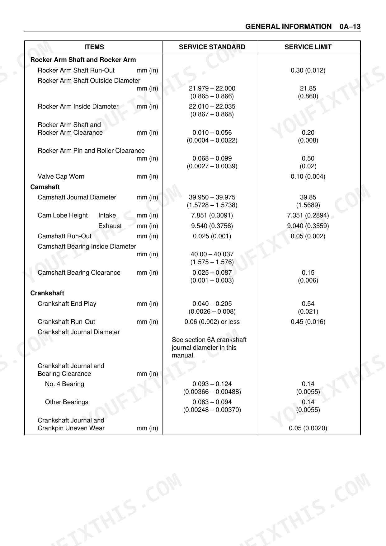 Turbocharger rotor shaft radial play (Standard)0.10 – 0.17 mm (0.0039 – 0.0067 in)p. 238