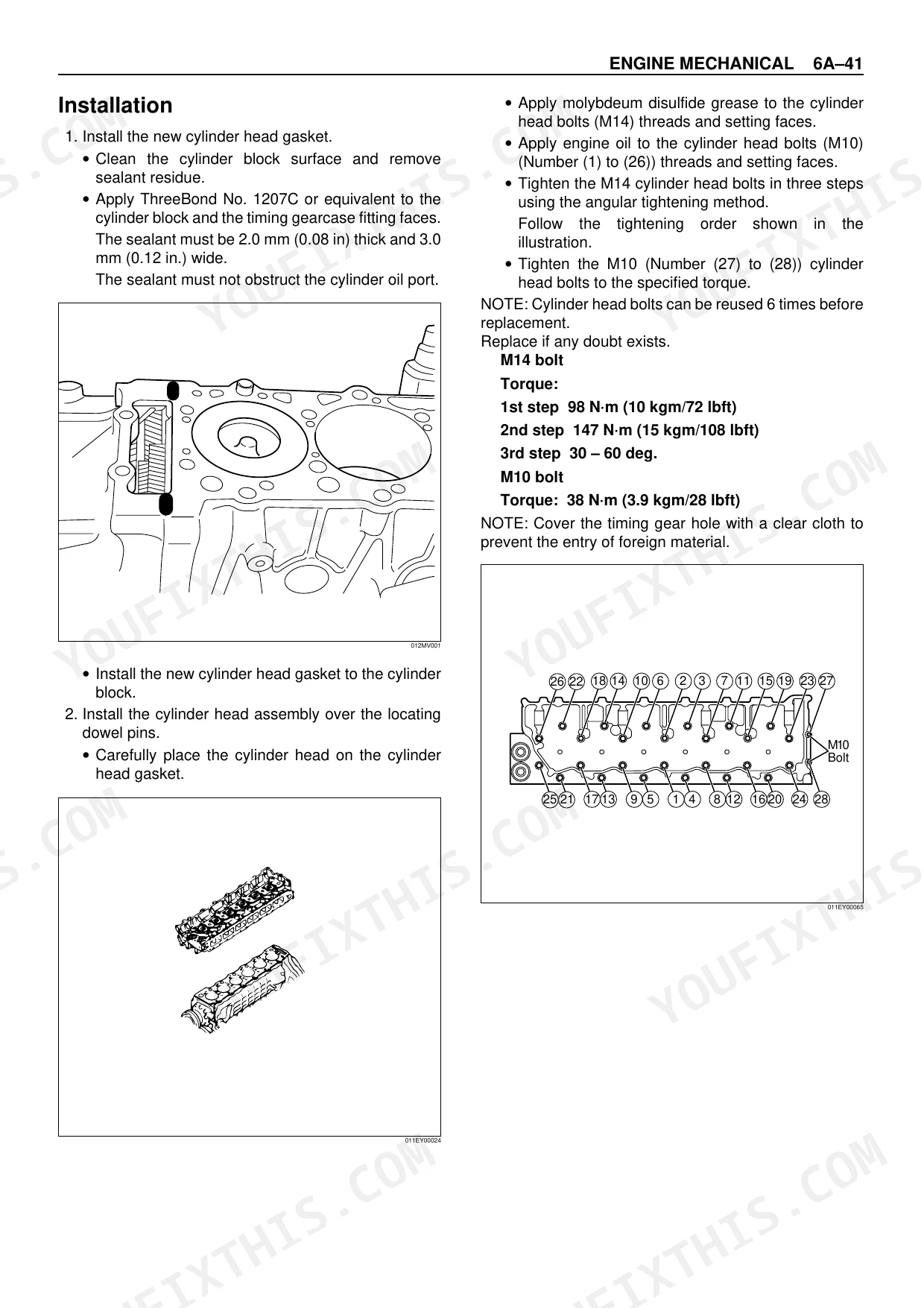 M14 cylinder head bolts require a three-step angular sequence: first to 98 N·m (72 lb-ft), then 147 N·m (108 lb-ft), followed by an additional 30-60 degrees of rotation. M10 cylinder head bolts get a single-step torque of 38 N·m (28 lb-ft).