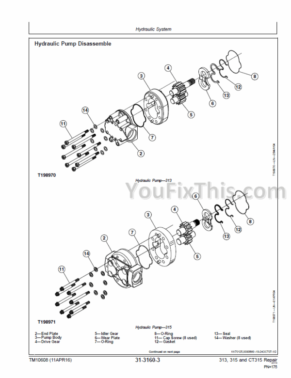 Factory Technical Repair Manual TM10608 11APR16 For John Deere 313, 315, CT315 Skid Steer & Compact Track Loaders. Tons of illustrations, instructions, diagrams for step by step remove and install, assembly and disassembly, service, inspection, repair, troubleshooting, tune-ups.