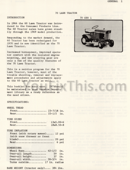 In 1966 the 60 Lawn Tractor was introduced to the Consumer Products Line. The 60 Tractor sales have grown steadily through the 1969 model production. Responding to the market demand, the 60 Tractor has been redesigned for 1970 and is now identified as the 70 Lawn Tractor. Increased horsepower, improved operator comfort with the isolated engine mounting, and new steering gear are only a few of the quality features of the 70 Lawn Tractor. This is a service program for the 70 Lawn Tractor, however, most of the trouble shooting, removal and replacement procedures and adjustments apply to the 60 Lawn Tractor as well. This booklet has many uses. It should be maintained in your Service Department library as a ready reference as the need arises.