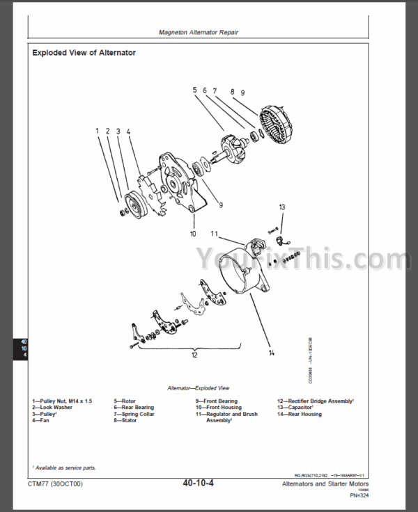 Factory Service Repair Manual CTM77 For John Deere Alternators and Starter Motors. Contains the latest available instructions necessary to repair engine alternators and starter motors. It includes theory of operation, and diagnostic and testing procedures to help troubleshoot and understand potential failure modes. Tons of illustrations, instructions, diagrams for step by step remove and install, assembly and disassembly, service, maintenance, inspection, repair, troubleshooting, tune-ups.