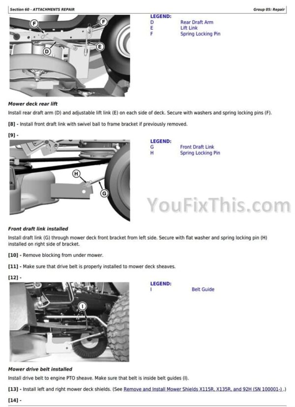 Factory Technical Service Manual TM113419 For John Deere X115R, X135R, X155R, 92H, 107H Riding Lawn Tractors (EXPORT). Detailed step by step illustrations, instructions, diagrams for Systems Diagnosis, System Theory of Operation, Performance Testing, Tests and Adjustments, Operational Check, Operation, Unit Locations and Identification, Schematics and lot of other useful information. Includes electrical wiring diagrams and a lot of other useful information for repair and servicing.